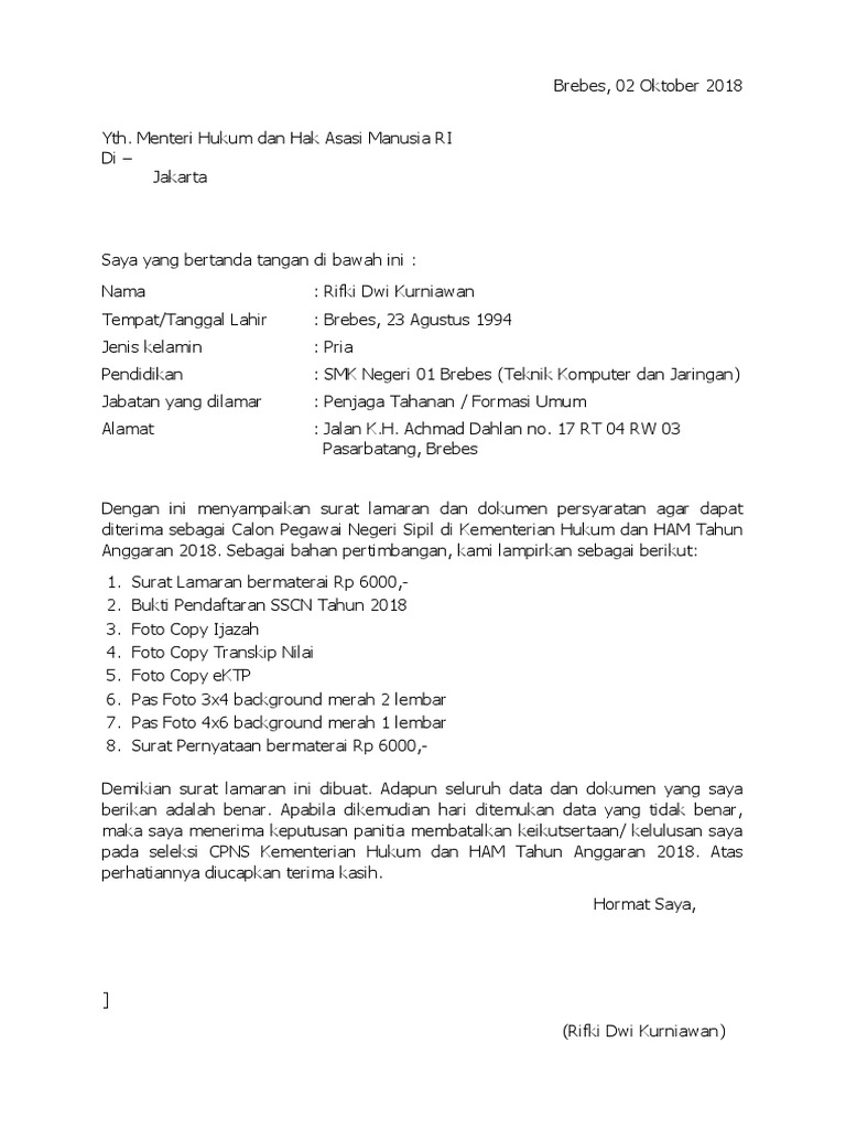 Lamaran pekerjaan di lingkungan kementerian hukum dan ham wilayah jayapura. Surat lamaran adalah satu di antara berkas atau dokumen yang diminta untuk mendaftar cpns. Dengan ini menyampaikan surat lamaran dan dokumen persyaratan agar dapat diterima sebagai calon pegawai negeri sipil di kementerian hukum dan ham tahun anggaran 2019. Ada banyak formasi yang dibuka dan tentunya menjadi peluang besar bagi anda yang ingin melamar kerja sebagai cpns. Format surat pernyataan dan lamaran cpns kementerian hukum dan hak asasi manusia ta 2018.